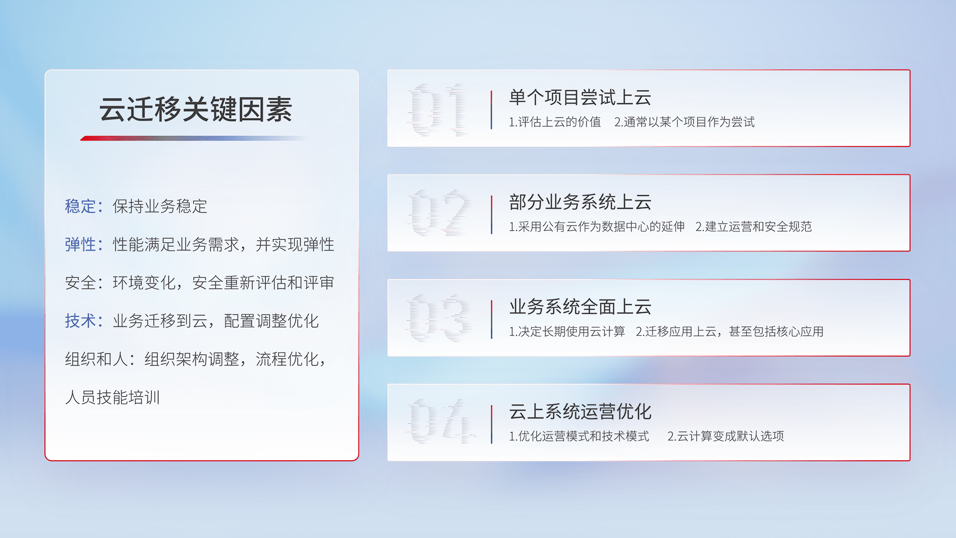 结合实际业务,,从规划设计、、云平台选型、、云原生改造、、、、数据迁移、、集成交付,,,迁移全过程为客户识别最佳上云路径,,,,做好风险识别管理,,,设计网络架构、、身份权限、、、、安全审计合规、、操作审计、、、日志审计、、监控告警策略、、多站点容灾设计等,,,对云上基础设施进行整体规划,,,,提升IT治理水平,,,以满足弹性、、、高可用、、、、高性能的需求。。。。