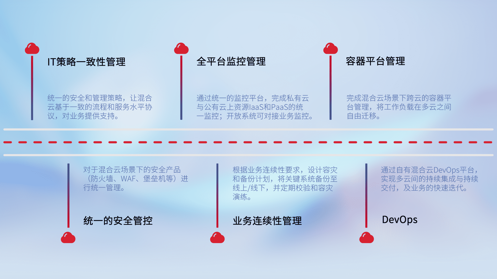 通过多云纳管,,,,以统一的资源数据模型把客户的云资源进行抽象和封装,,进而实现对多云资源的统一操作,,保障云资源管理的可靠性、、、稳定性与可用性。。。。量身定制化运维内容,,配置、、、开发运维、、补丁管理、、备份、、、、监控、、认证和访问管理、、审计和日常巡检等,,,保障在用云过程中的可靠度,,稳定度以及高可用率。。。